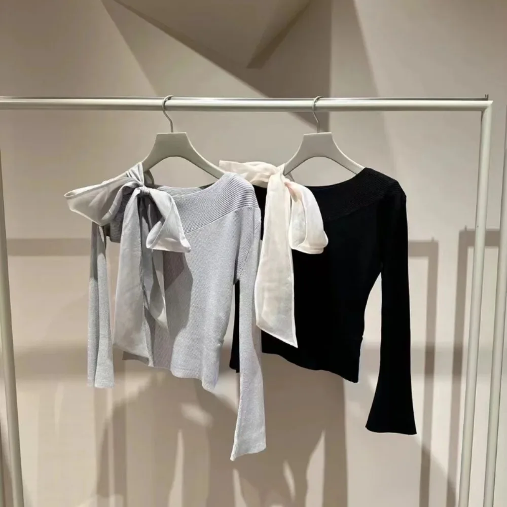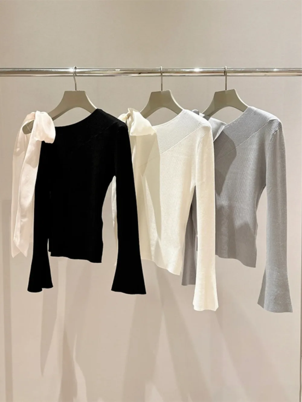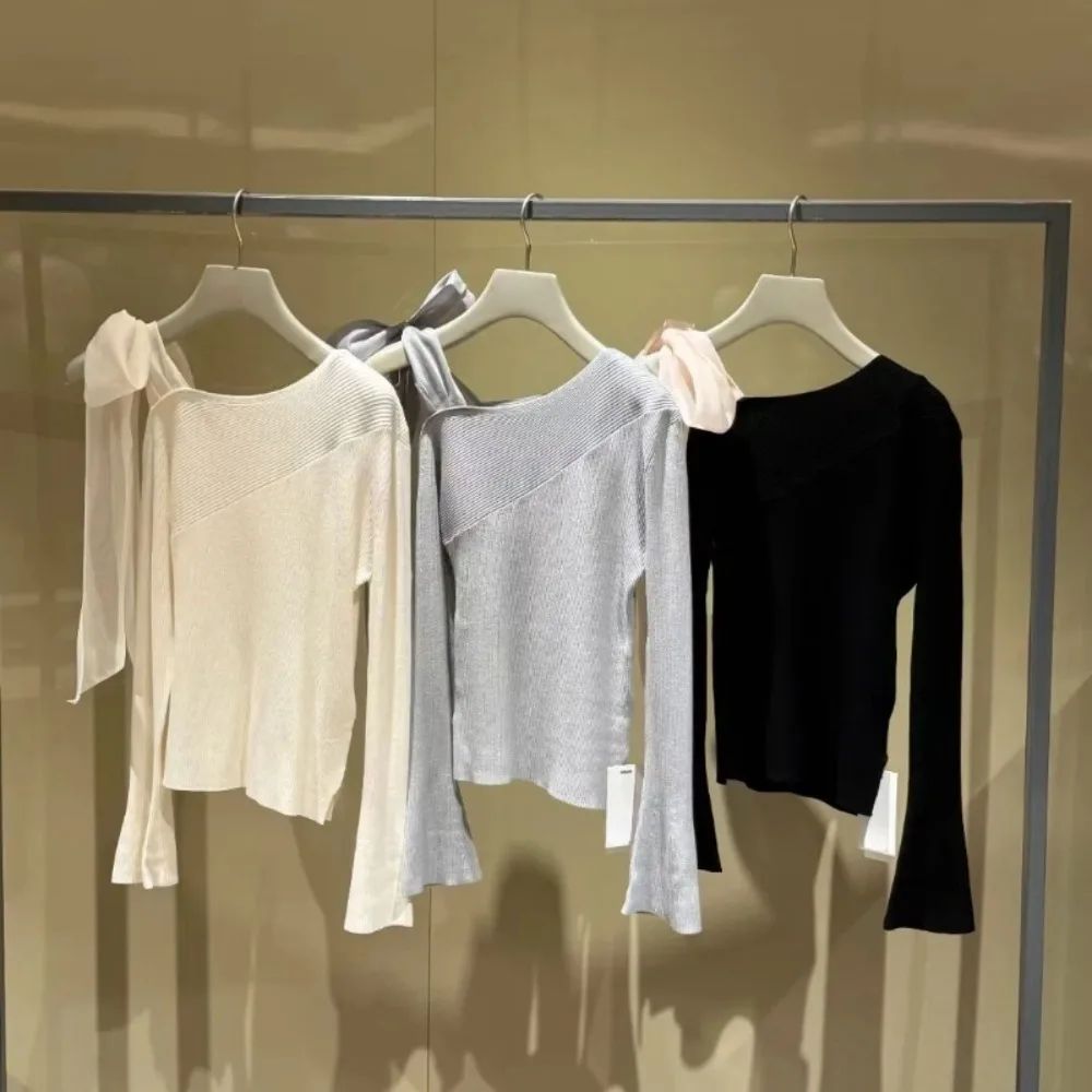 Kuzuwata Casual Skew Collar Flare Sleeve Off Shoulder Tops 1Y954