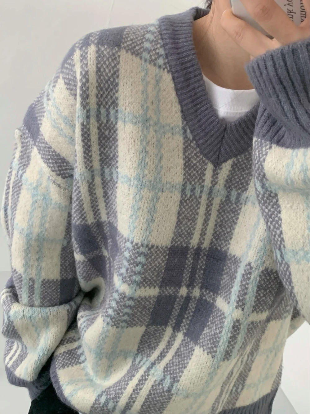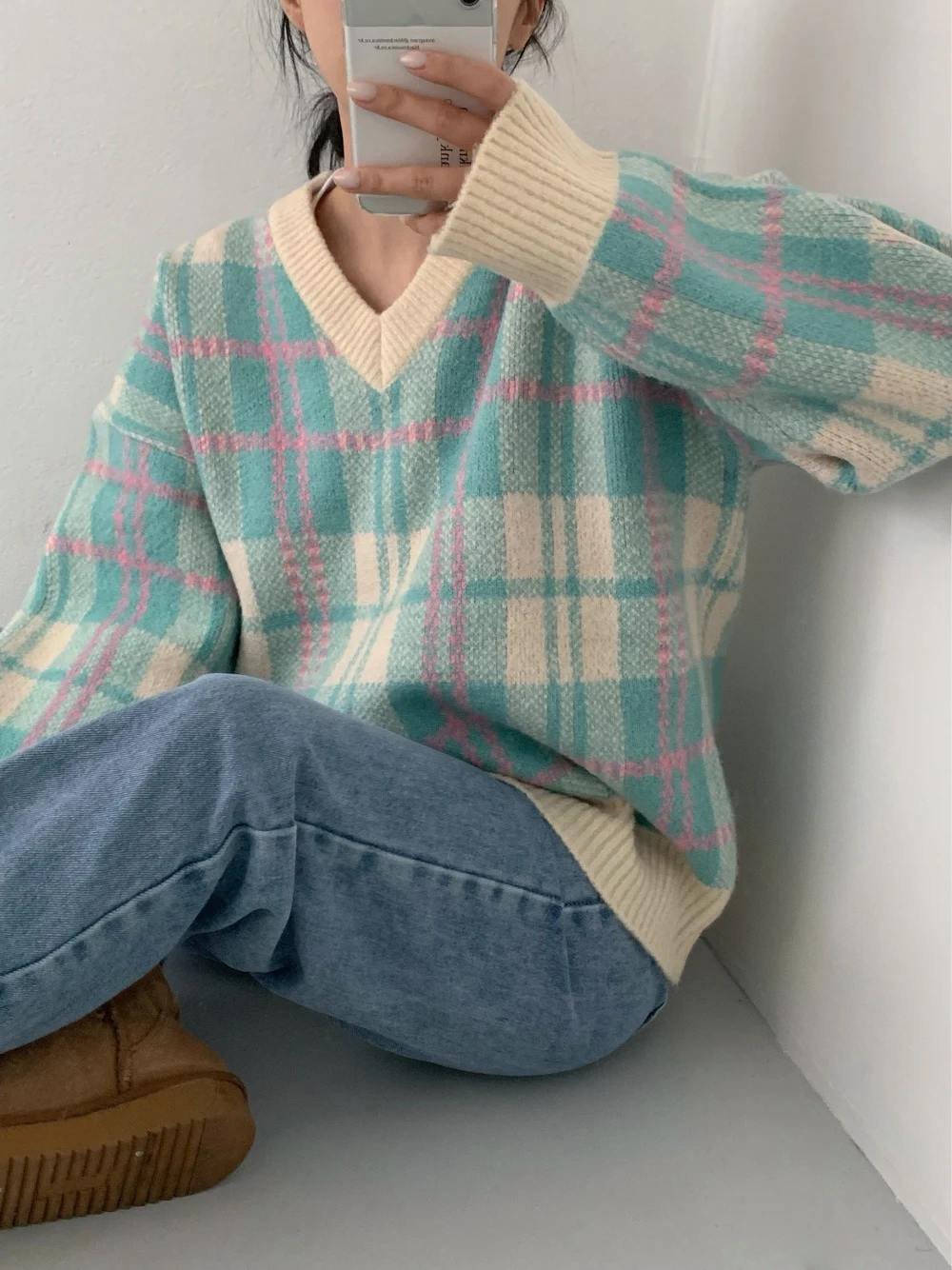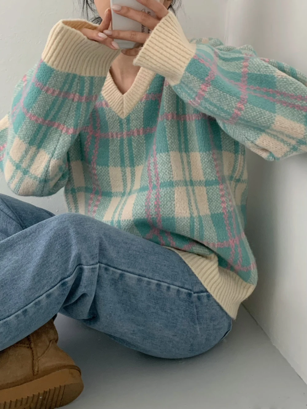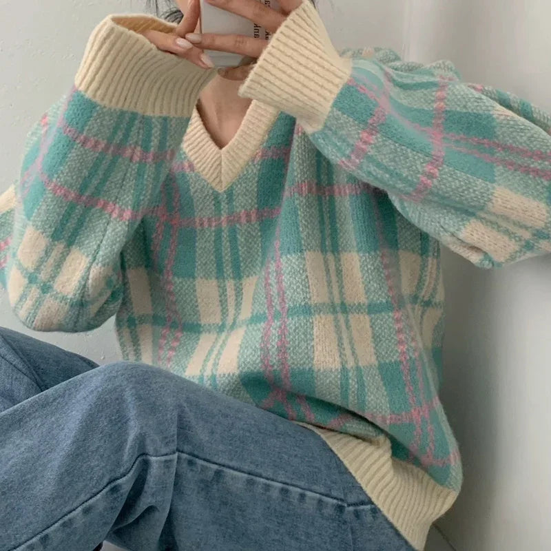 Plaid Striped V-Neck Pullover Stacked Knitted Sweater