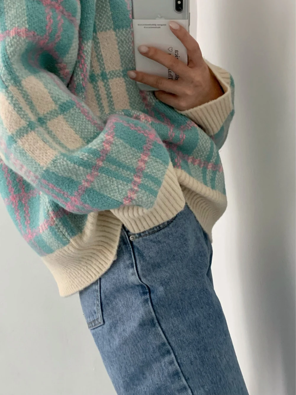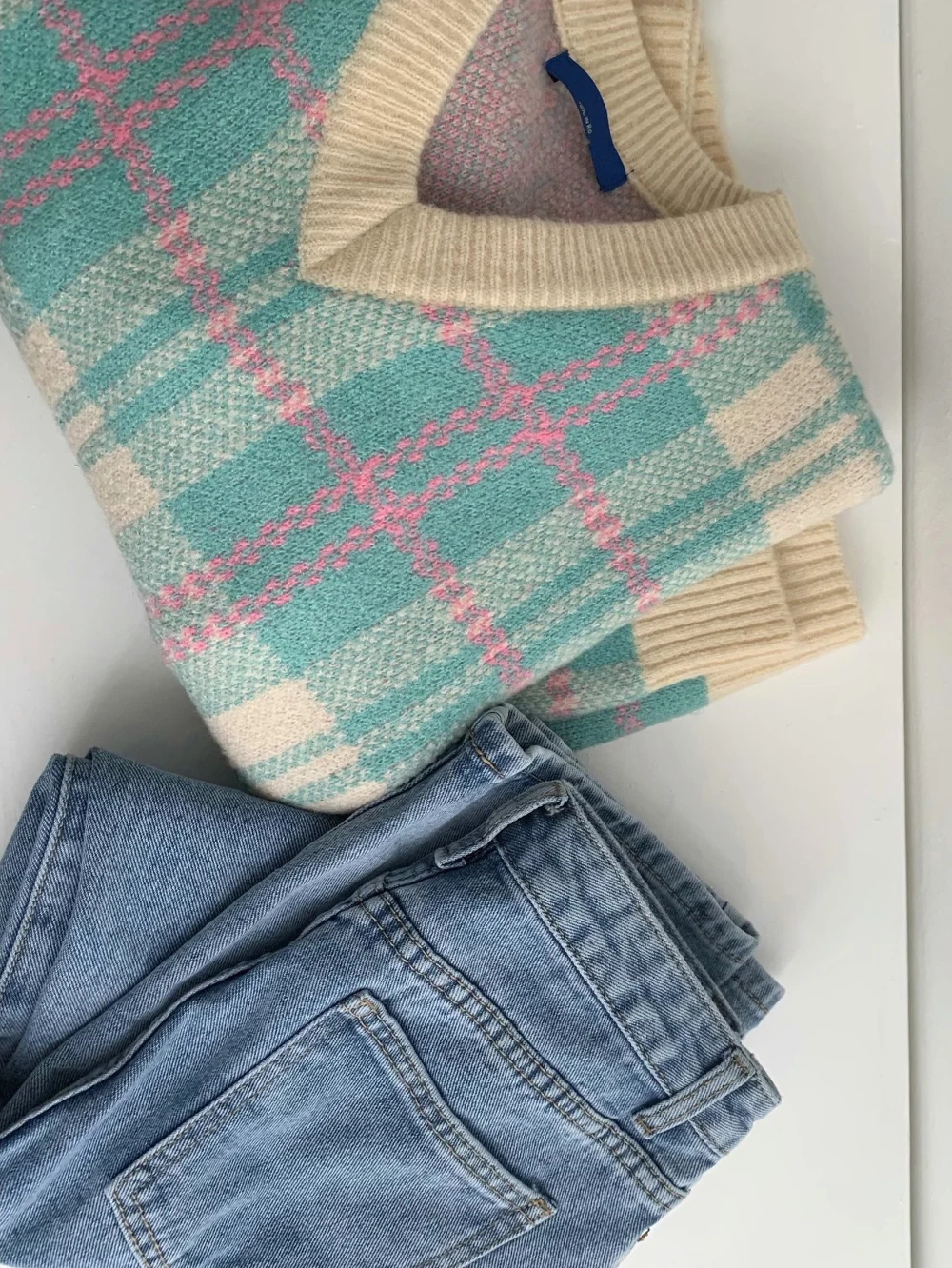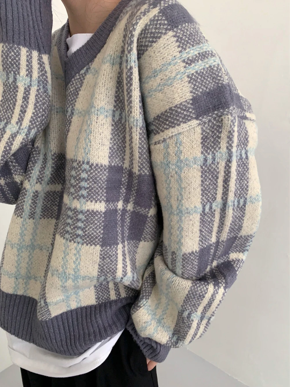 Plaid Striped V-Neck Pullover Stacked Knitted Sweater