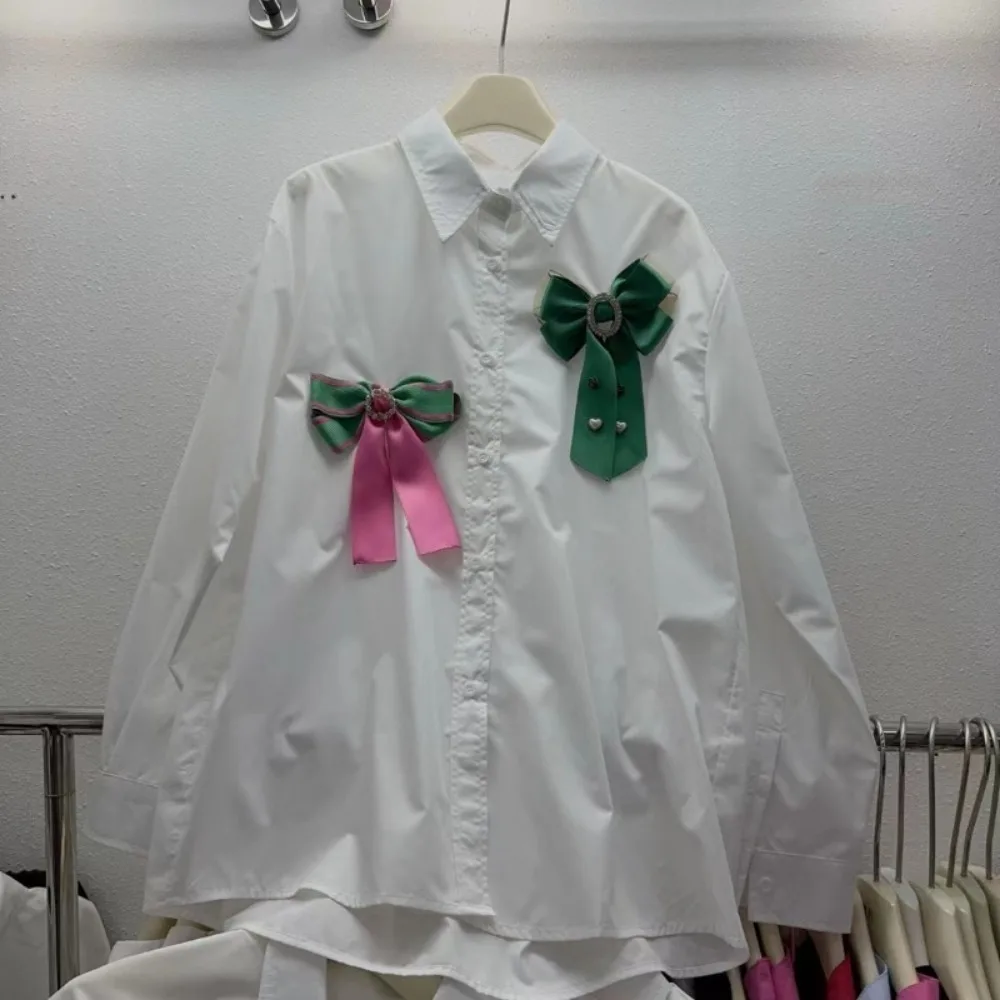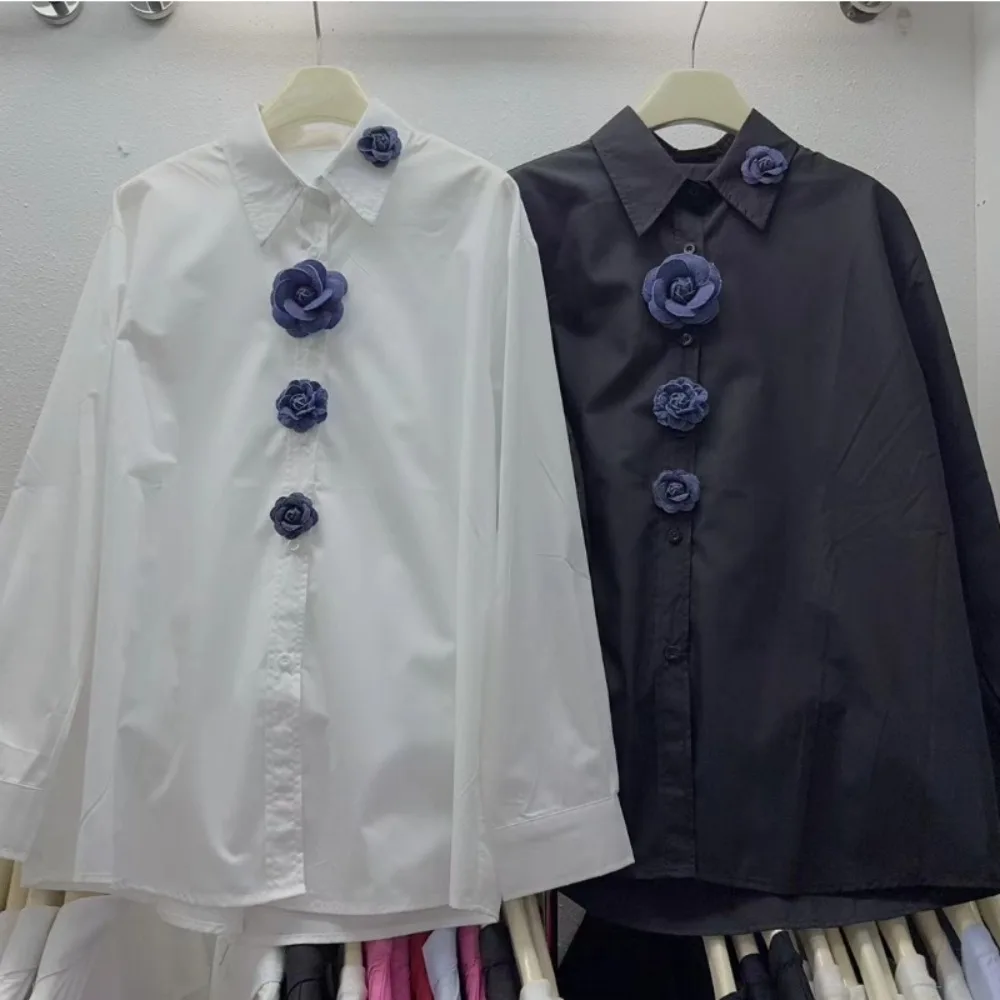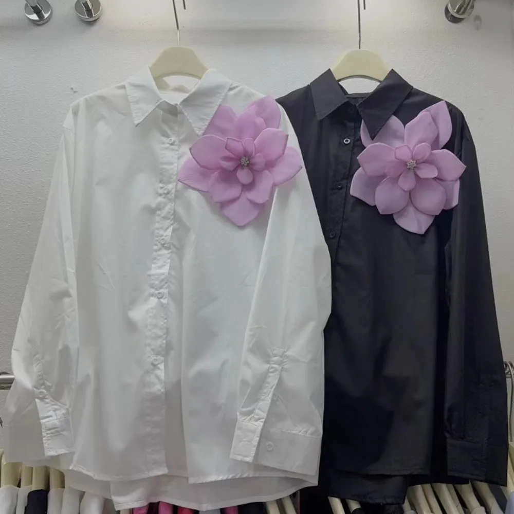 Neploe New Moda Turn-down Collar Long Sleeve Solid Shirt Single Breasted Bow 3D Flower All-match Blouses Summer Casual Fresh Top