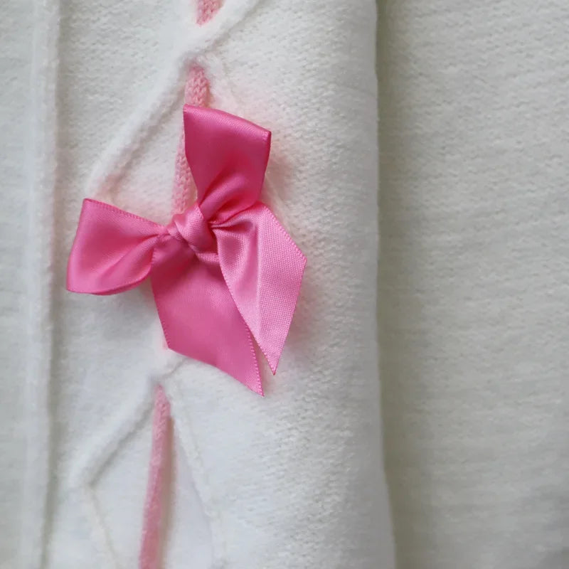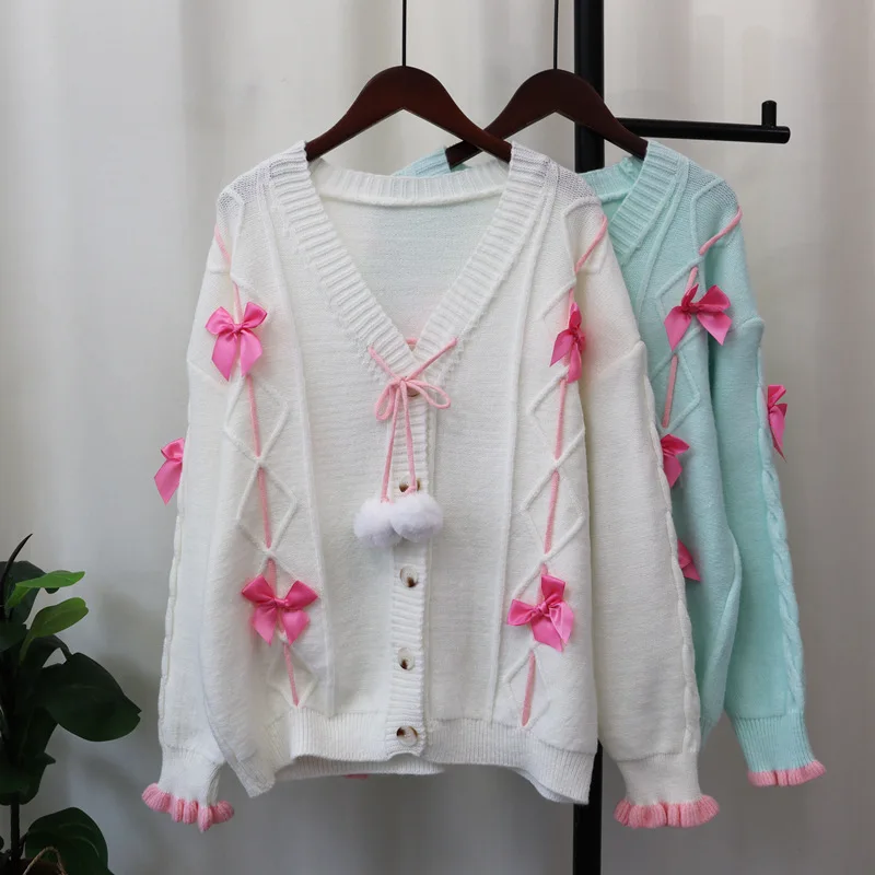 Sweet Bow 2024 Woman Cardigan Loose Lazy Style Ropa Mujer Autumn New Outerwears V-neck Single Breasted Sweater Cardigans