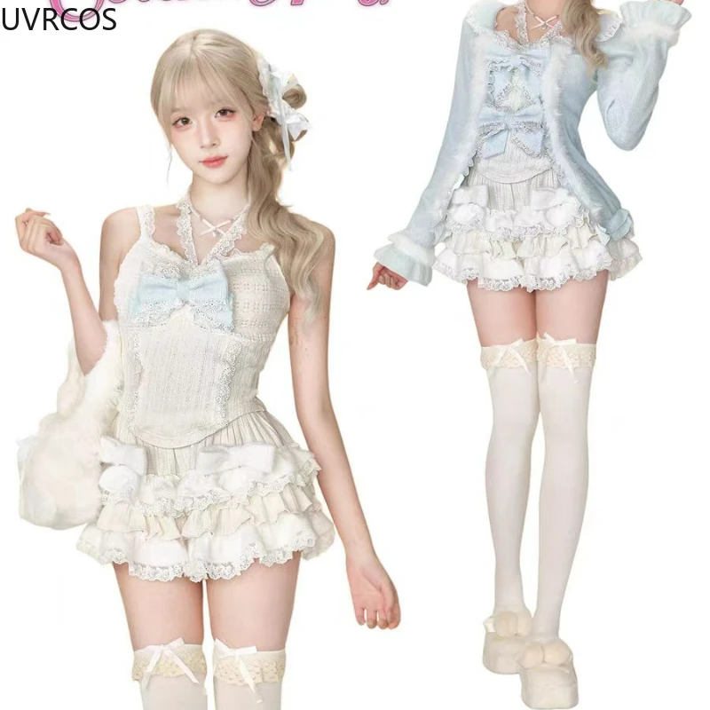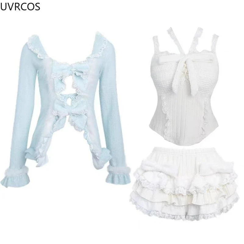 This Bow Plush Cardigan is a new Sweet Lolita Lace Bow Plush Cardigan designed by the designer. It is very cute Sexy Slim Fit Strapless Vest Tops+ High Waist Ruched Skirts