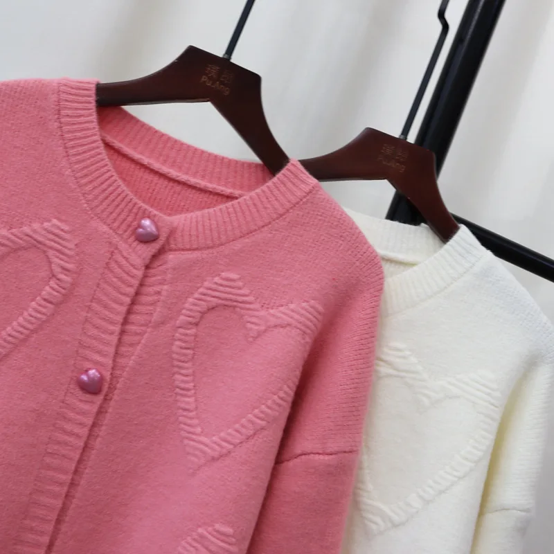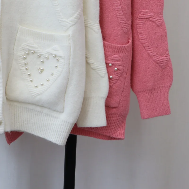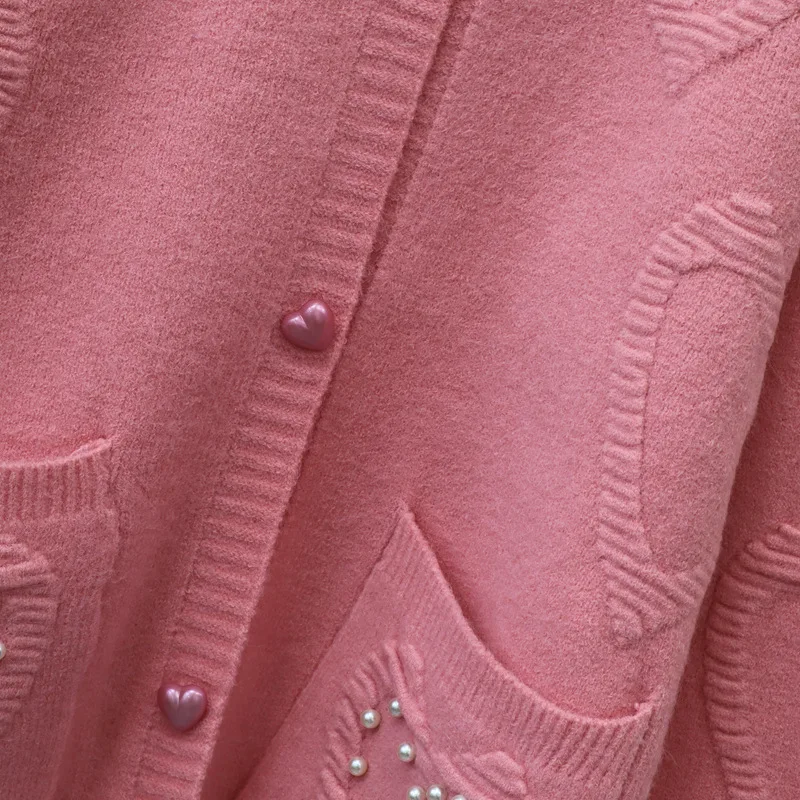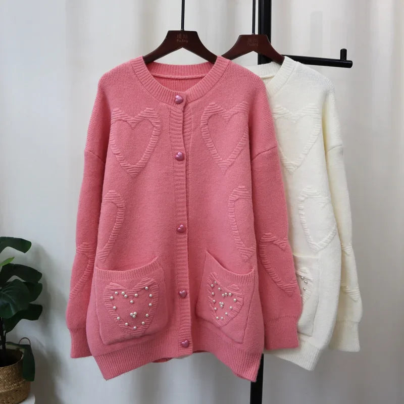 Sweet Love Heart Beads 2024 Woman Cardigan Exquisite Button Ropa Mujer O-neck Long Sleeve Outerwears Loose Sweater Cardigans
